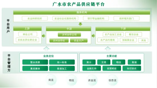 该供应链平台将整合盘活广水市农业产业链各方主体,集采集销,有效整合商流、物流、资金流与信息流,通过平台七大核心功能,即宣传展示、商品交易、物流体系、数据分析、金融支持、政策赋能、知识助农,依托四大端口即管理端、供应商端、消费端及宣传端,重塑广水市农业商业模式,逐步实现从科研育种、生产种植、仓储物流、加工销售至最终消费的高效协同,使广水农业从“单打独斗”的分散经营向“整体协作”的供应链模式转变,带动乡村合作公司产业发展,壮大村集体经济,促进农民增收。