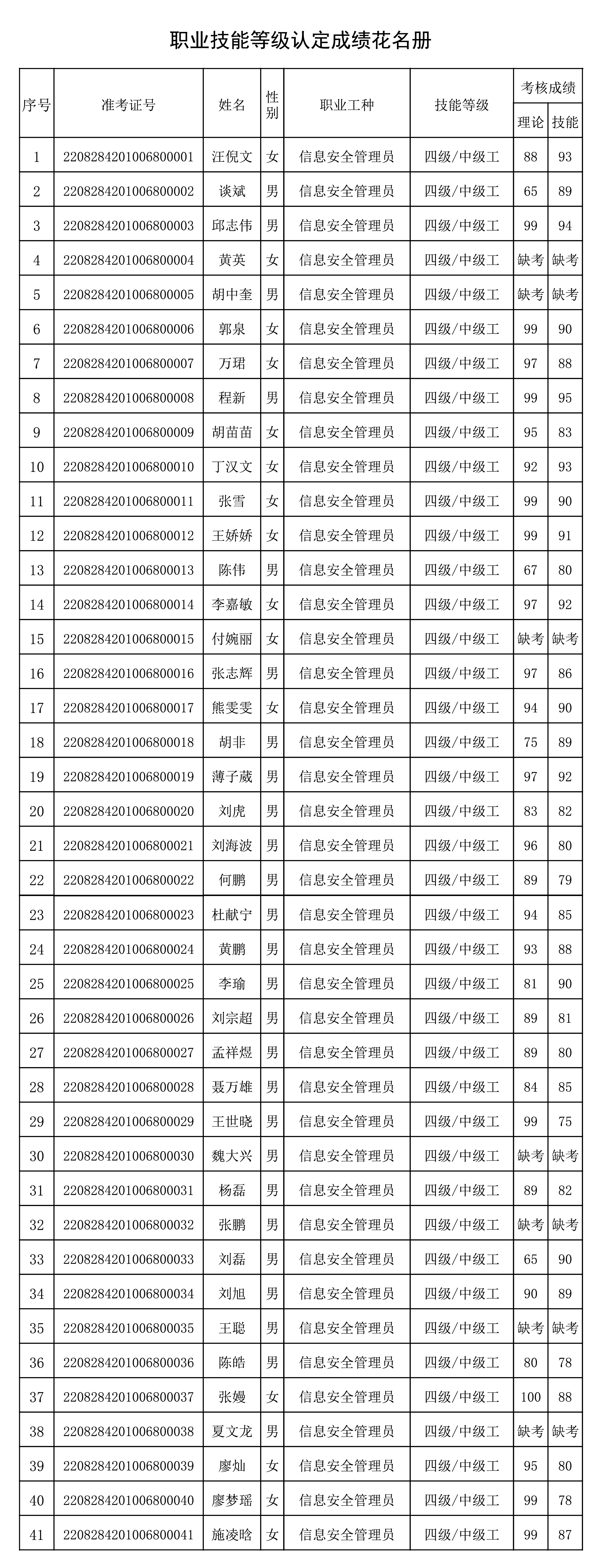 根据湖北省人力资源和社会保障厅《湖北省职业技能等级认定工作实施细则》([2020]45号)文件的有关规定,现将考生成绩予以公示。
